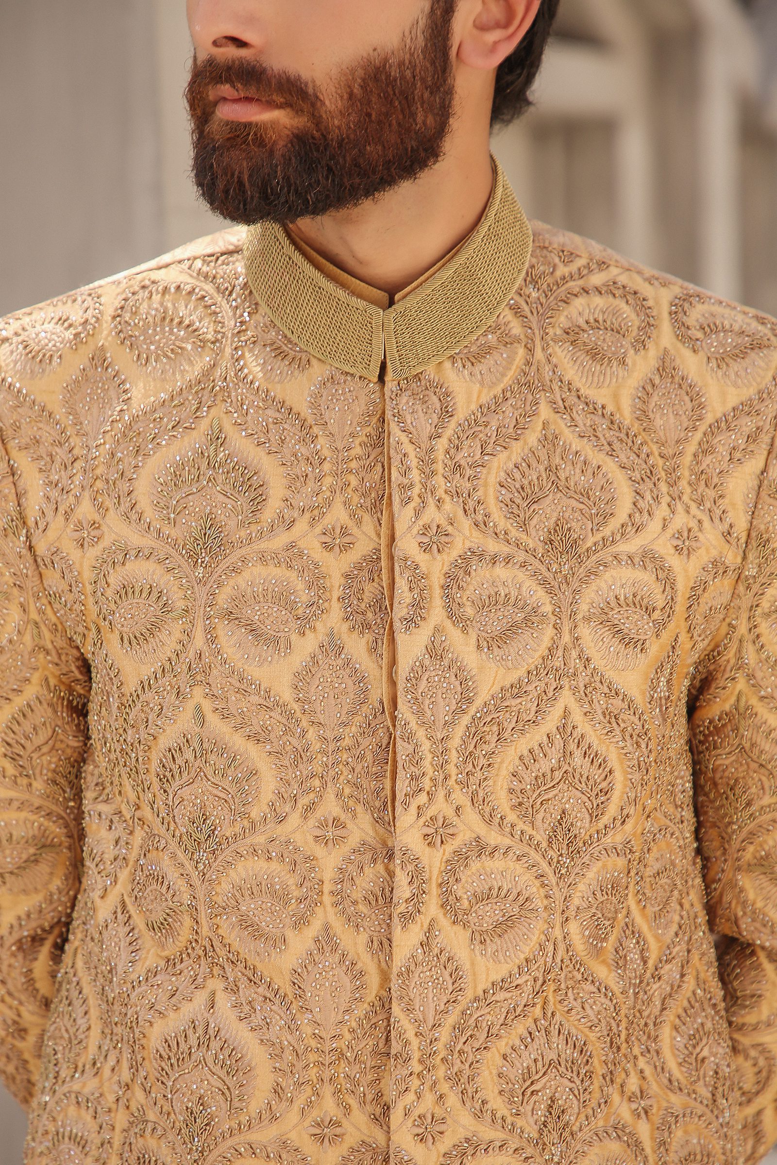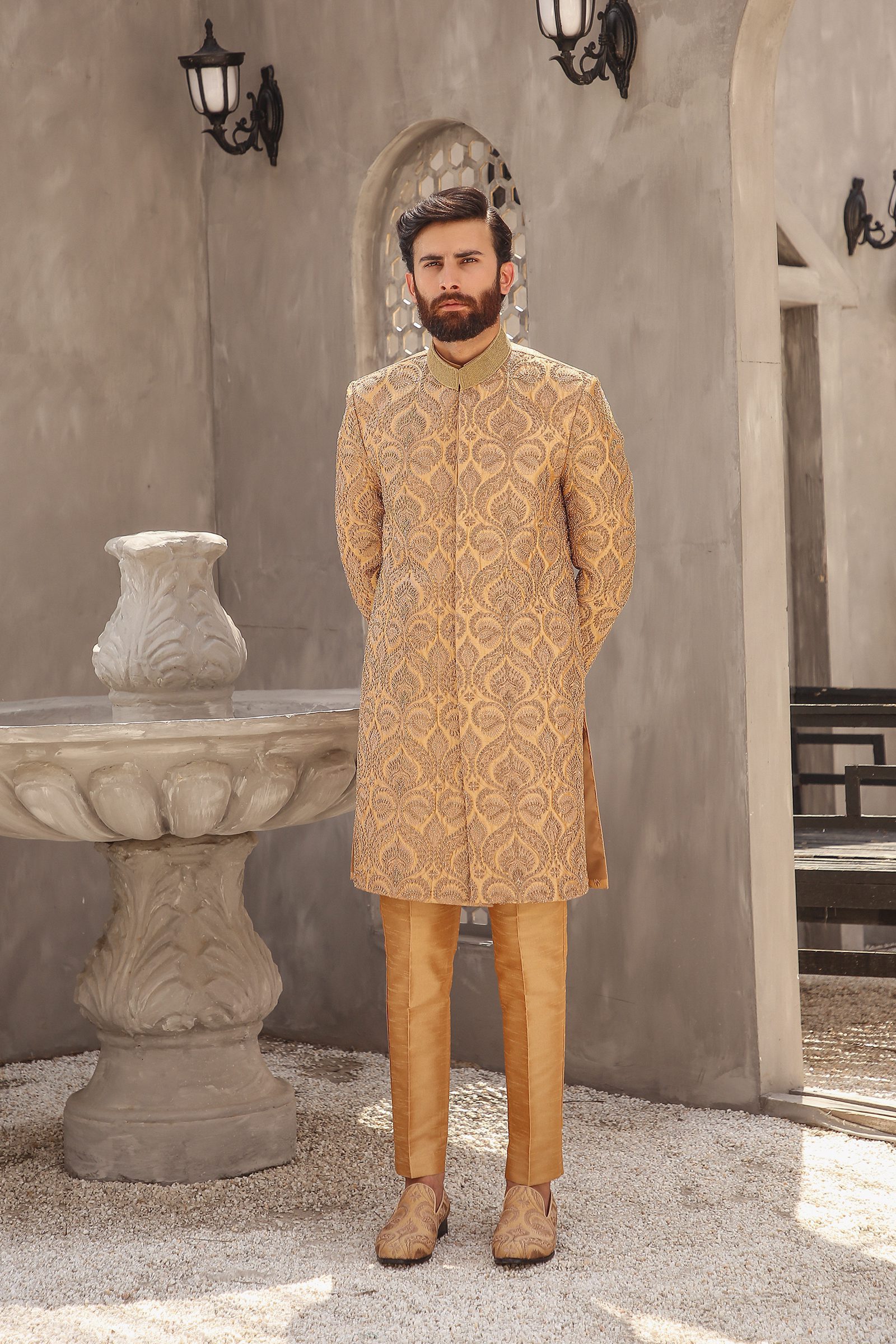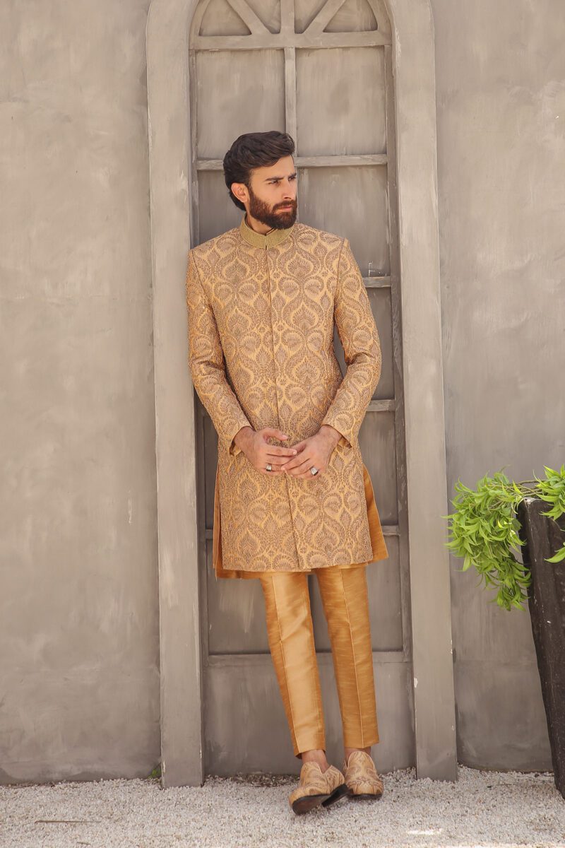 Look your best on your big day in Affordable Hayat Sherwani Online, a luxurious embroidered sherwani for grooms. Crafted from raw silk, this traditional wedding wear features intricate adda work in shimmering gold and fawn hues. Hayat will ensure you look handsome and stylish on your special day.