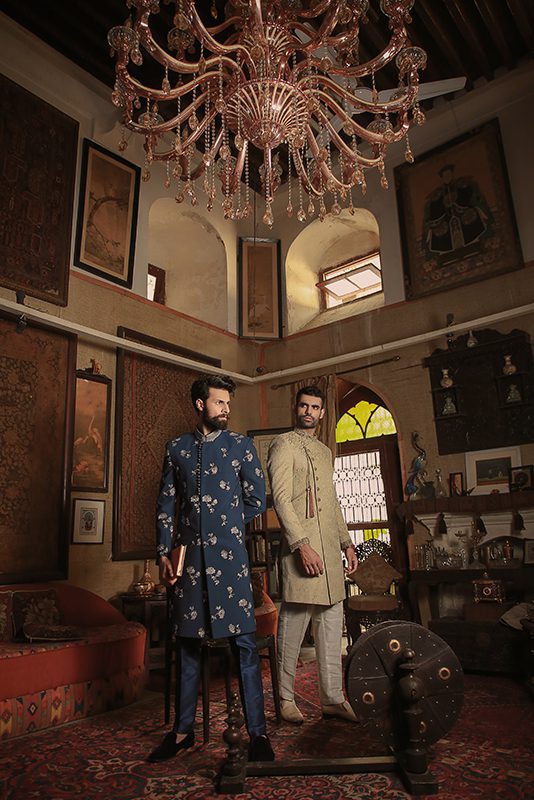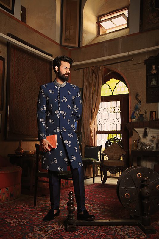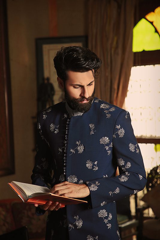 A prussian blue embroidered base constructed into a glorious sherwani. Intricate dabka work enhancing the band collar, amplifies it’s festive appeal.Classic embroidery sherwani styles