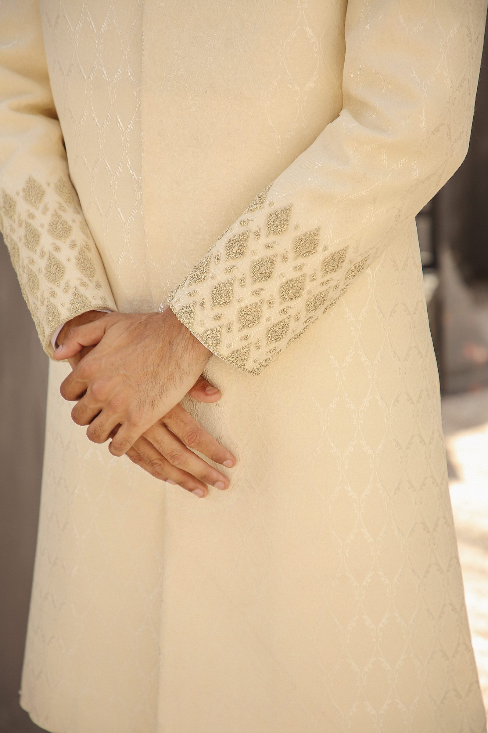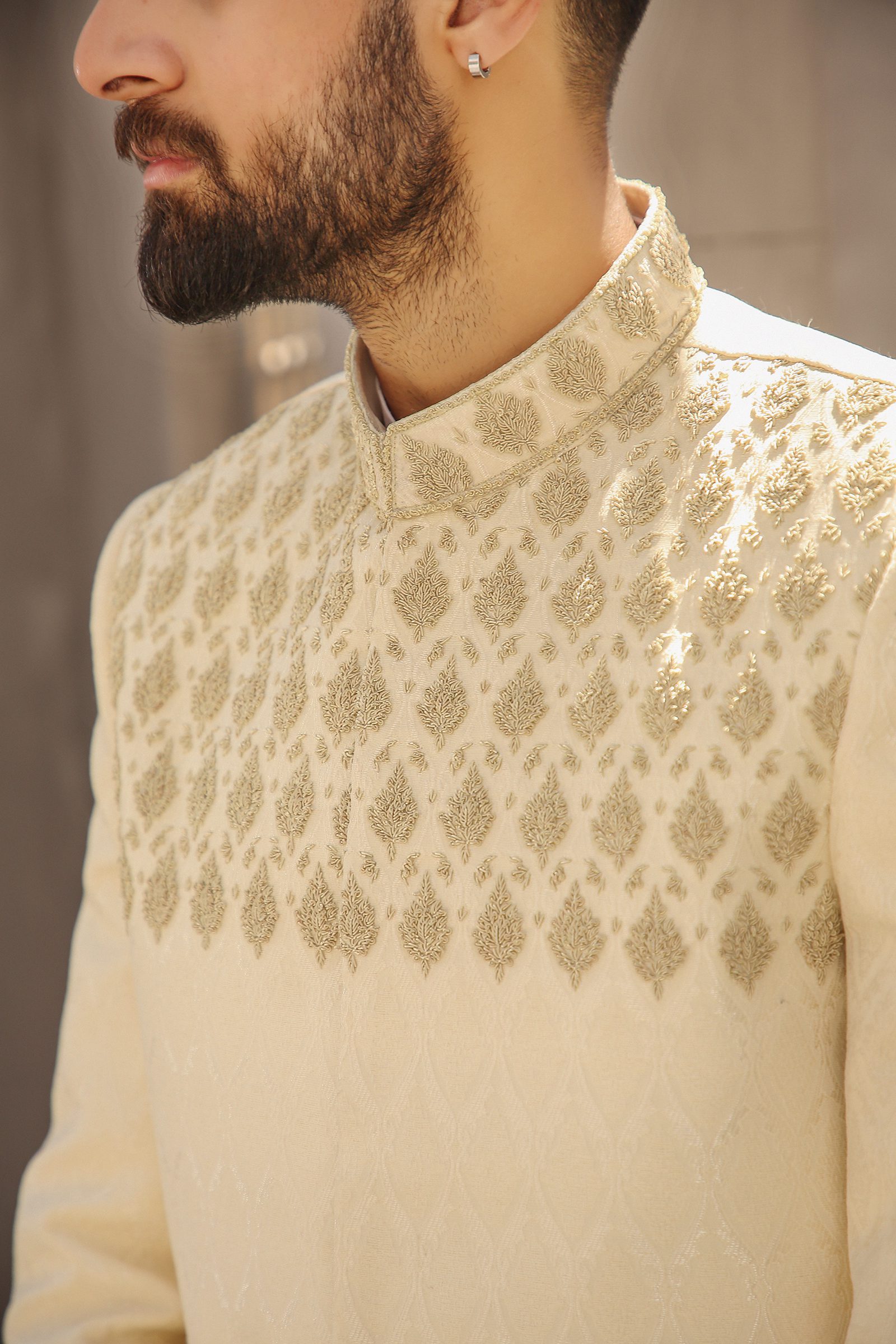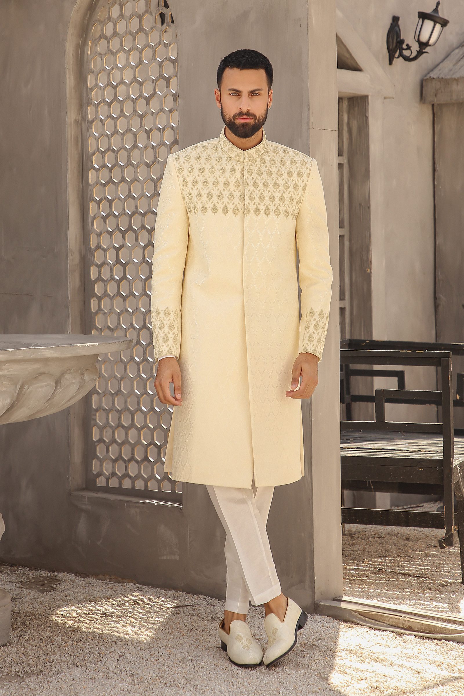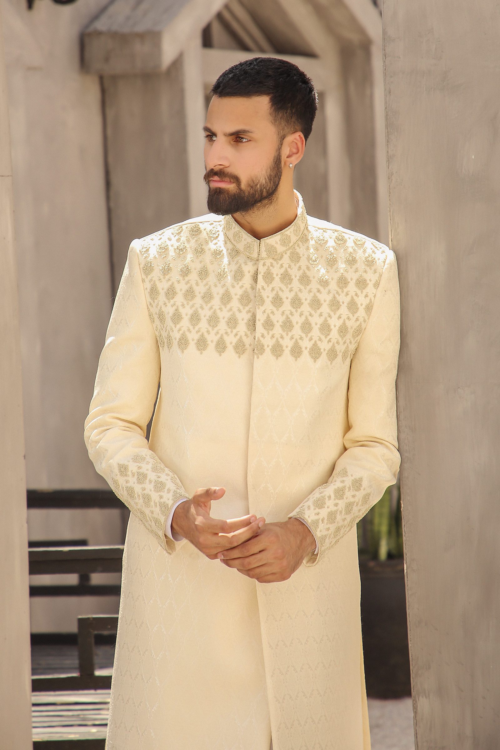 Men’s Sherwani In Pakistan Falak features luxurious cream-colored jamawar designs highlighted by intricate addawork. Perfect for special occasions, Falak Men’s Sherwani In Pakistan is the perfect choice for a groom’s sherwani or wedding wear.