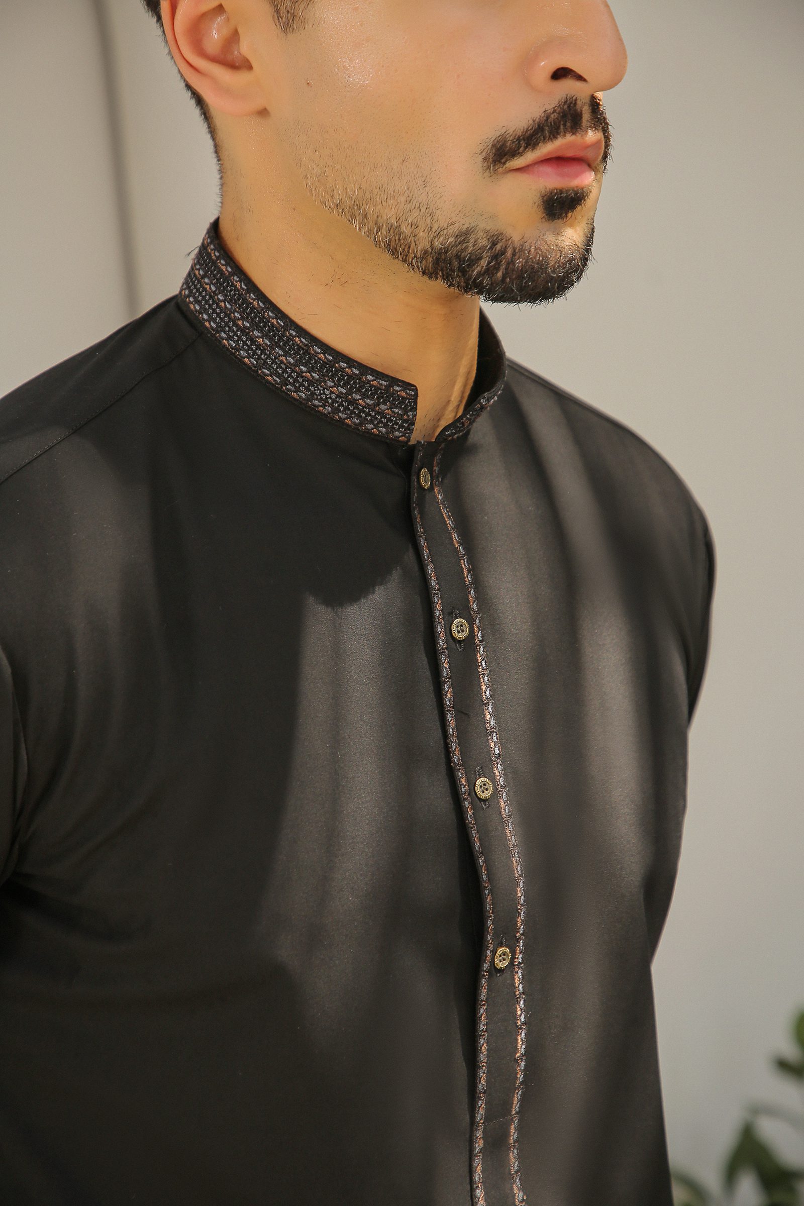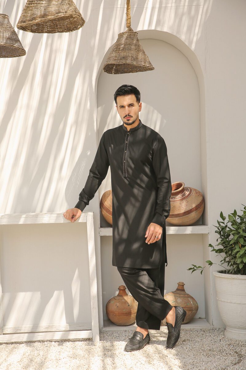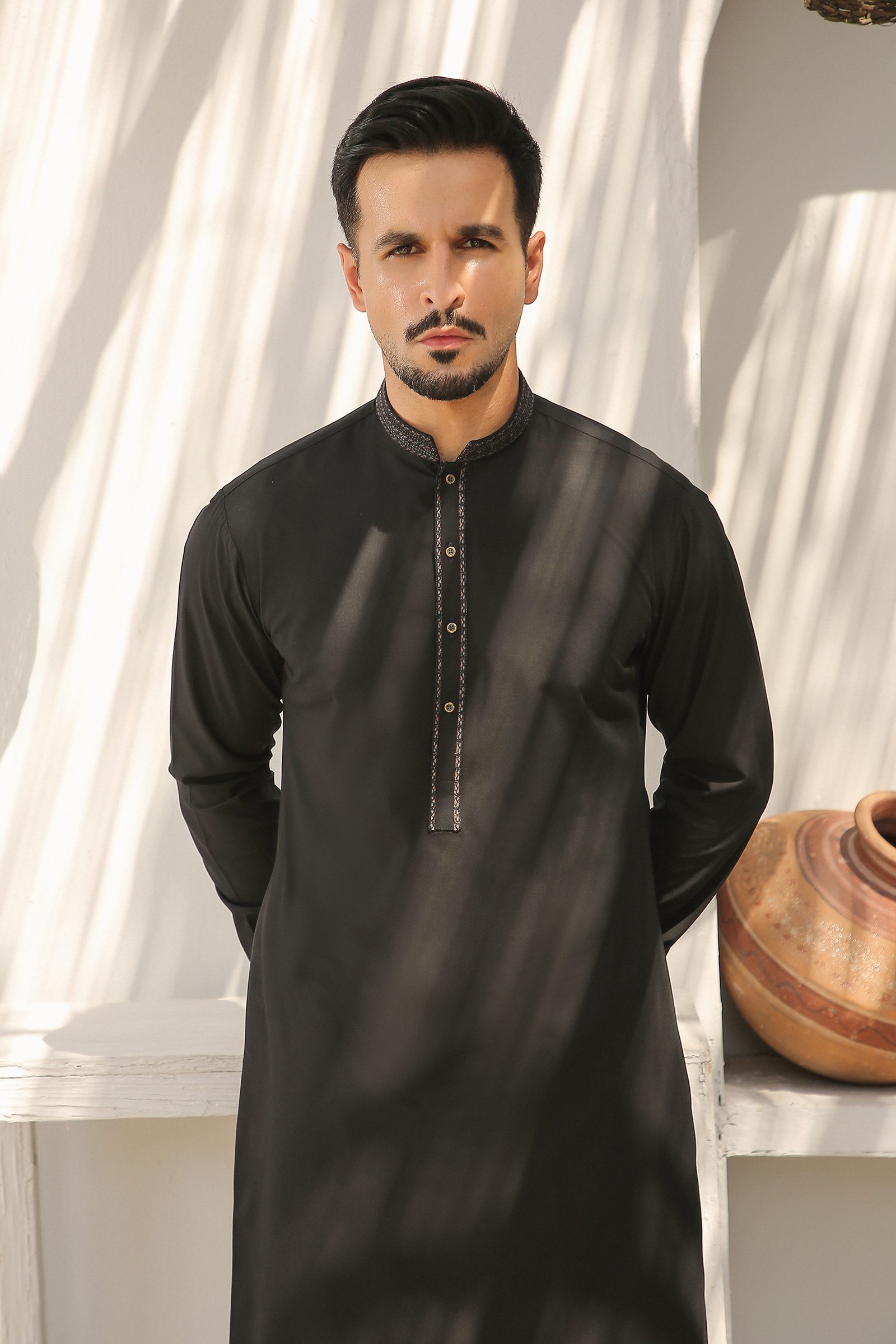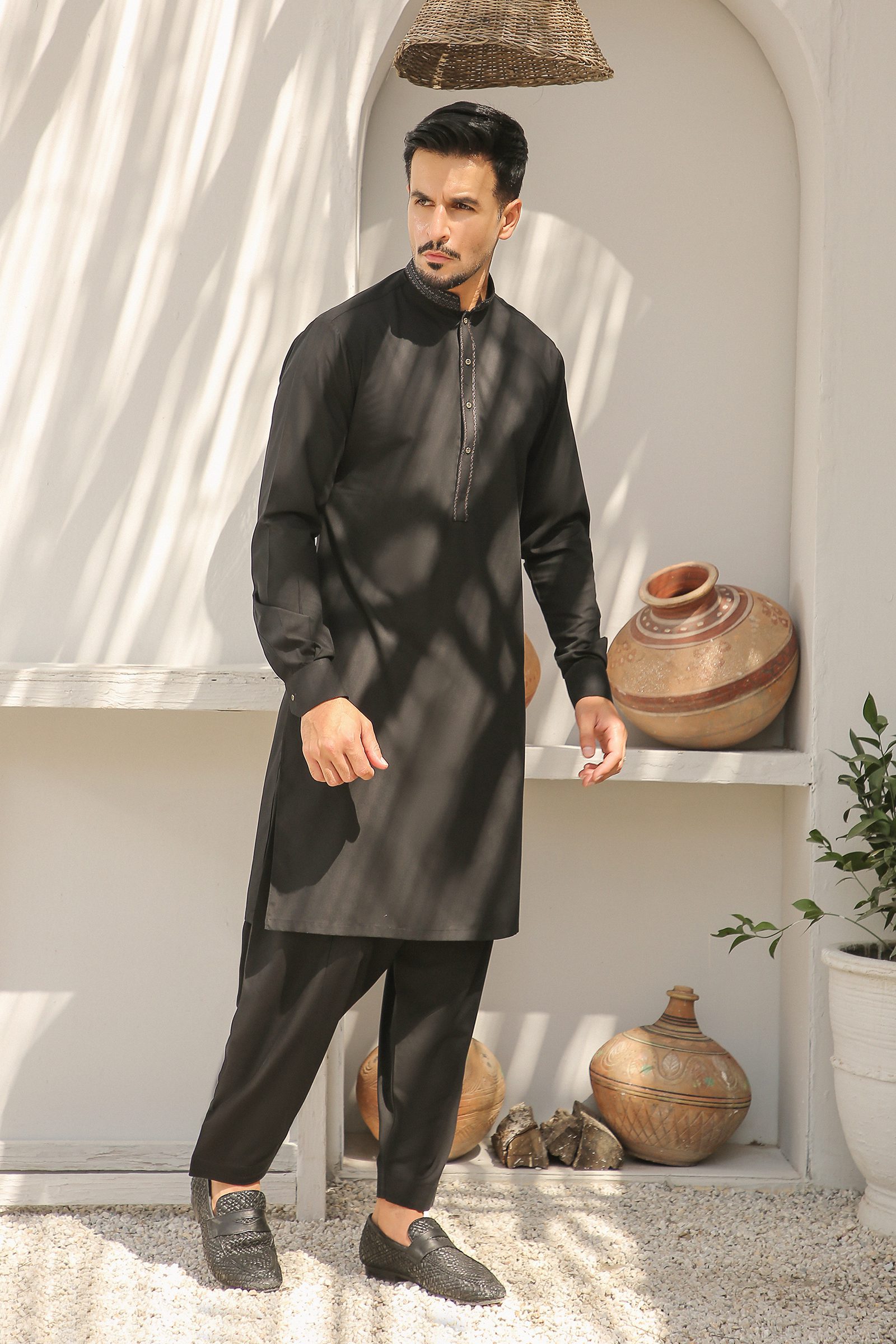 Qalb is a stylish option for any wardrobe. This shalwar kameez design features an embroidered band collar and front placket, giving you a sharp fit and ultra-modern look. Finished with a classic black colour, Qalb is an ideal choice for formal or casual wear.Shop Qalb shalwar kameez online in Pakistan