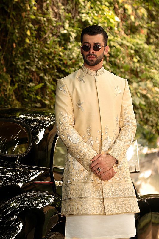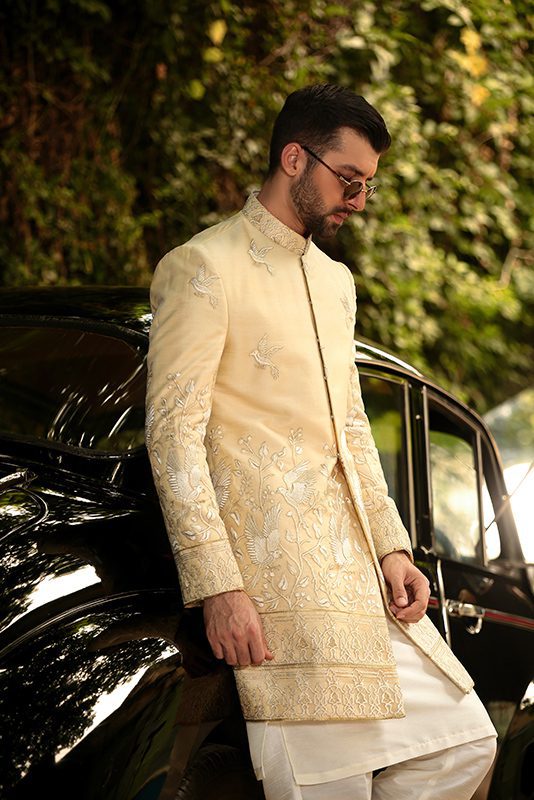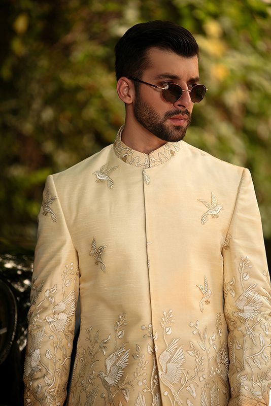 Experience a captivating aura with an off-white organza canvas adorned by spectacular embroidery. This swanky sherwani exudes a charming energy, combining luxurious craftsmanship with an elegant presence that’s bound to leave a lasting impression.